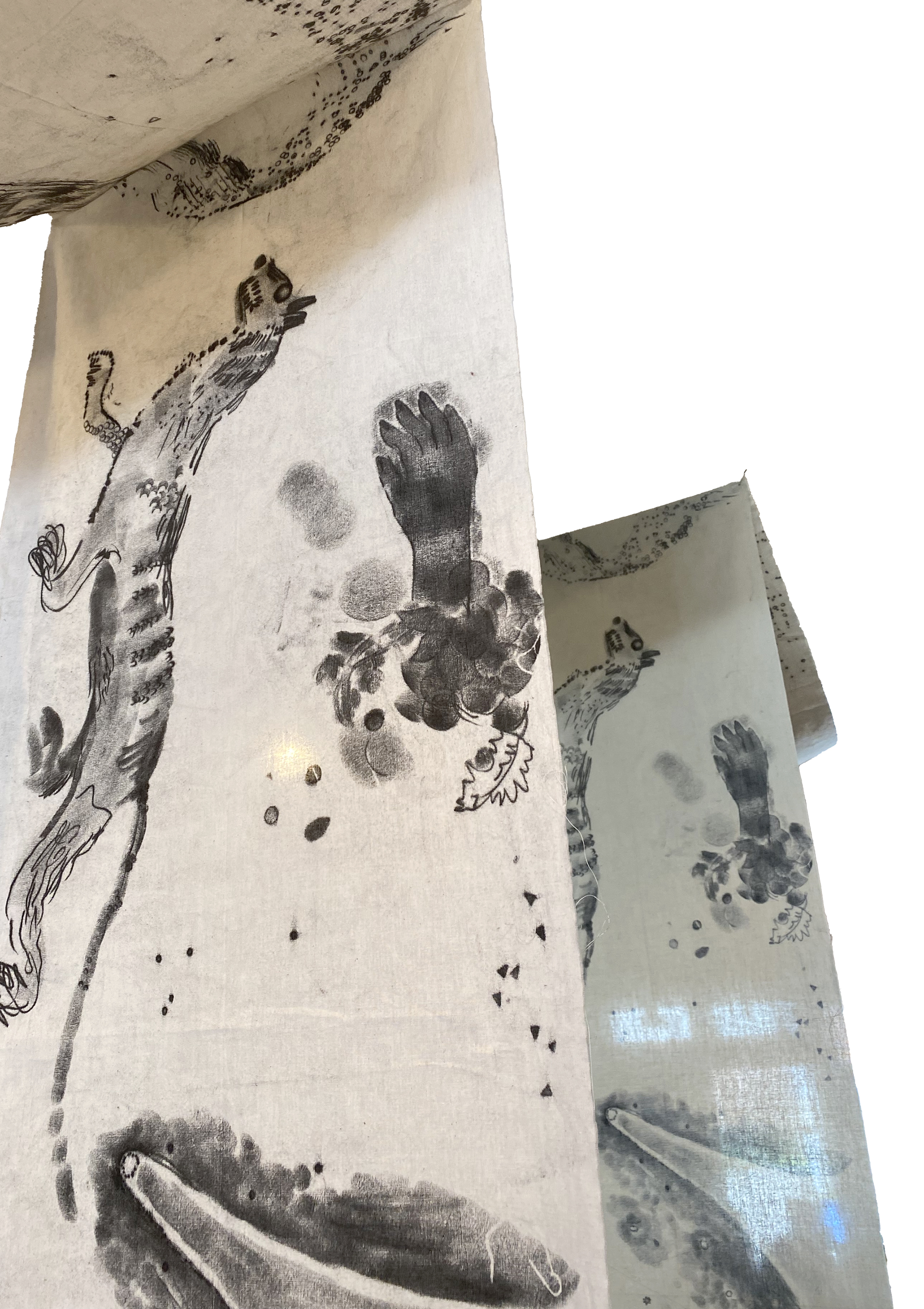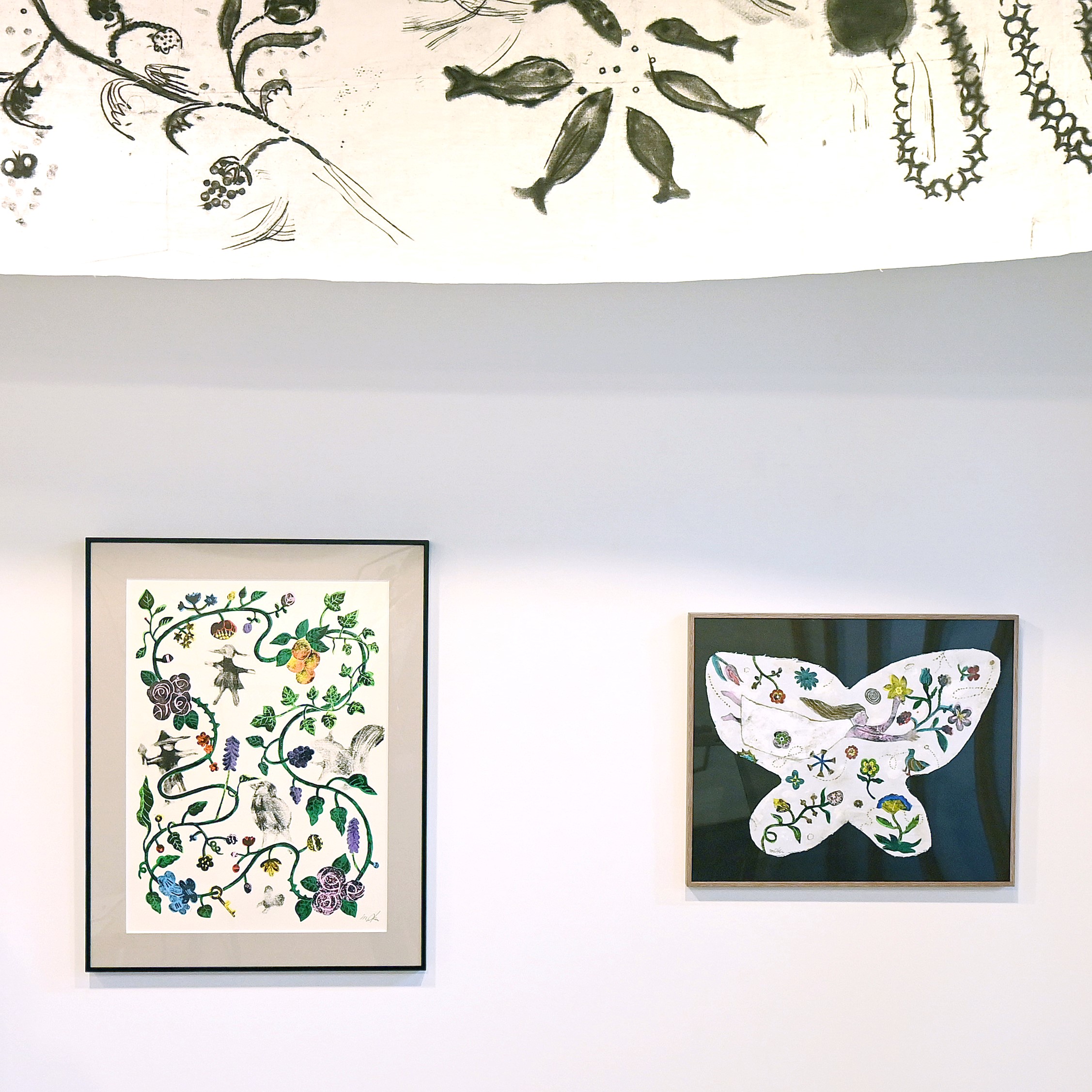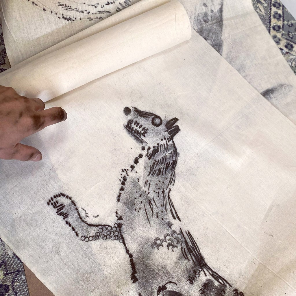 神話やアニミズムをベースとして制作される数多の作品は、軽快でありながら力強さを感じさせます。本展覧会で展示される“圧痕版画”と作家に名付けられた12メートルの作品は、指とスタンプ台を使った独自の方法論によって制作されています。これらユニークな作品は、即興性と実験的試みによって生み出され、漠とした根源的な要素を内包しつつある種のユーモアとエンターテイメント性を感じさせるものとなっています。是非この機会にご高覧頂ければ幸いです。