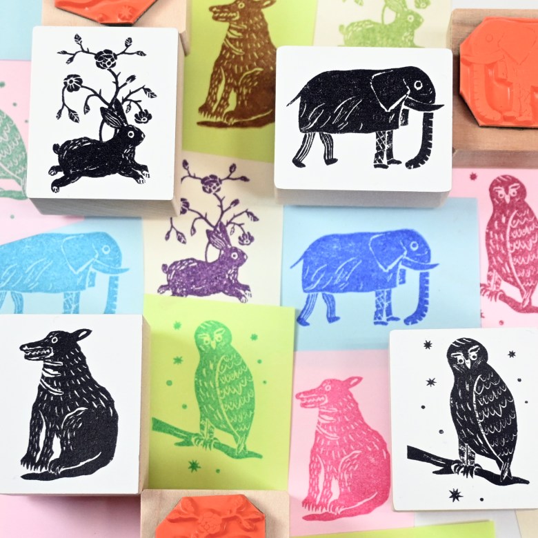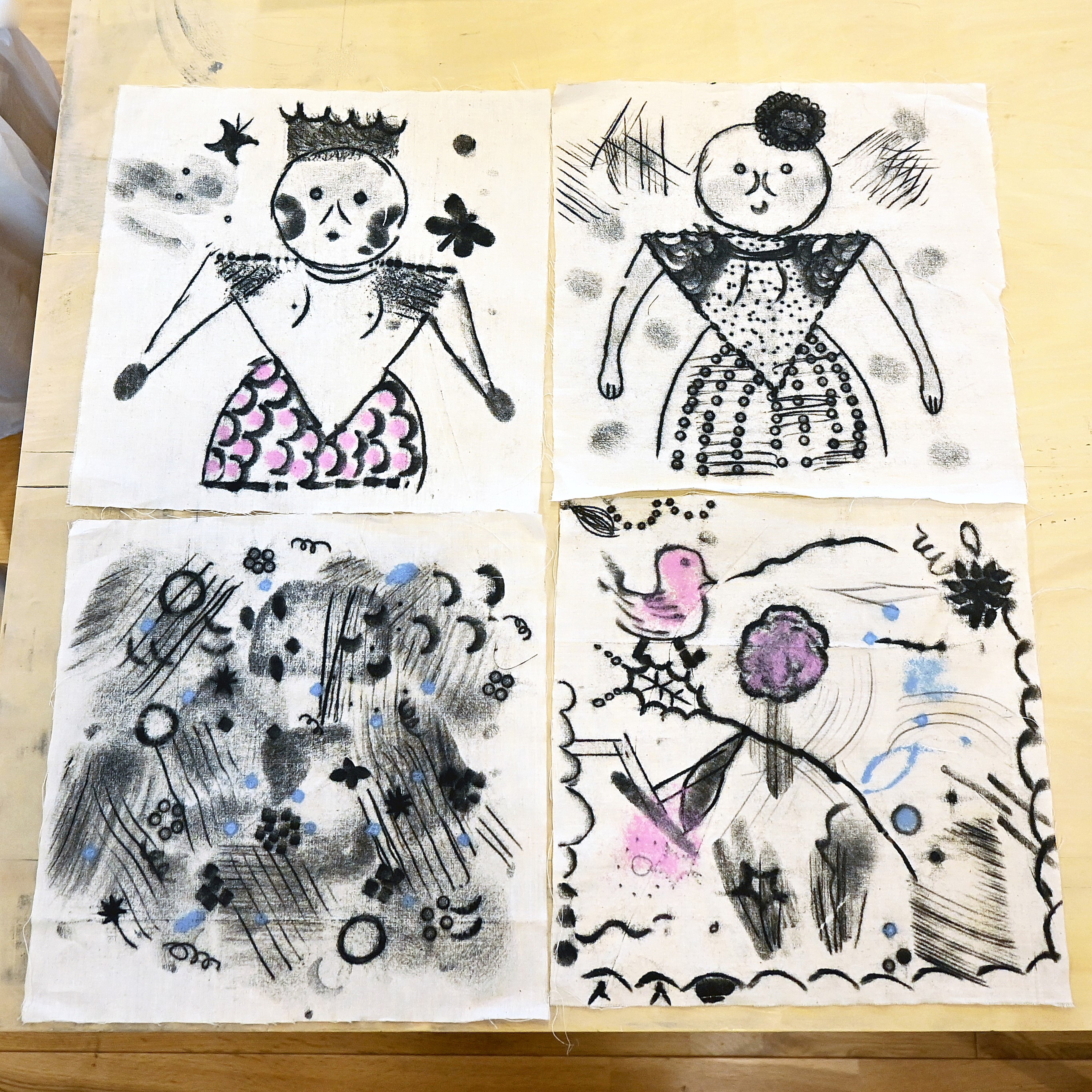 スタンプ台に布を重ね、その上から指や道具で押しながら描くオリジナル技法「圧痕版画」。