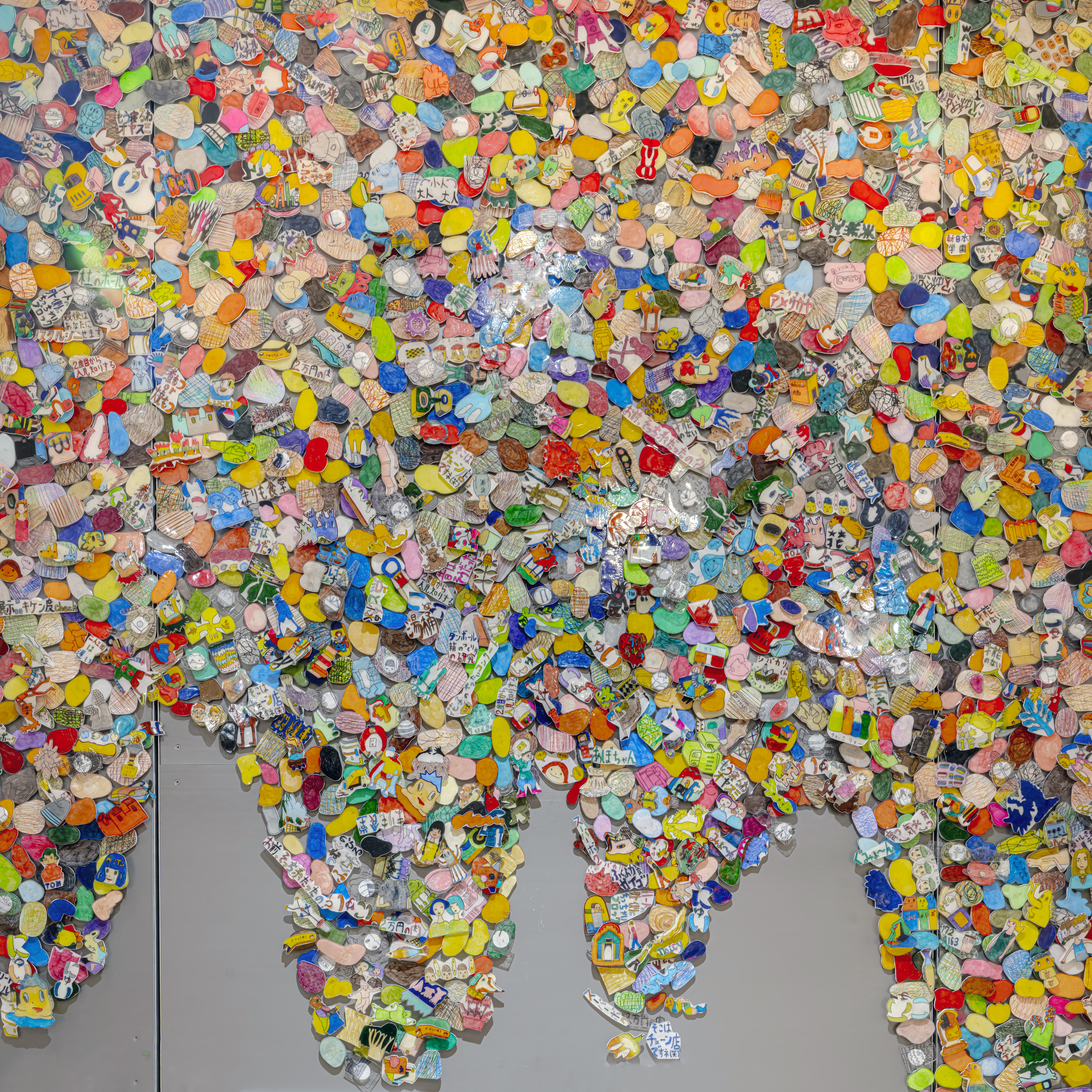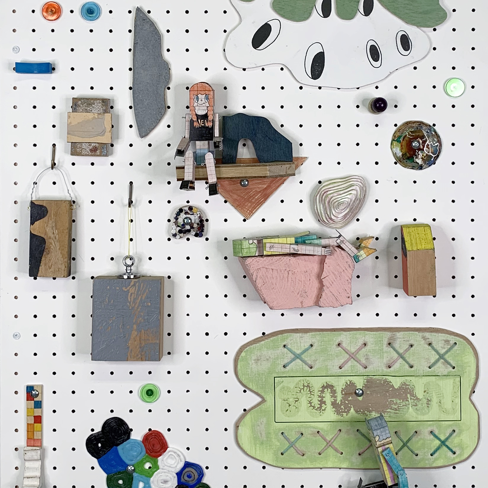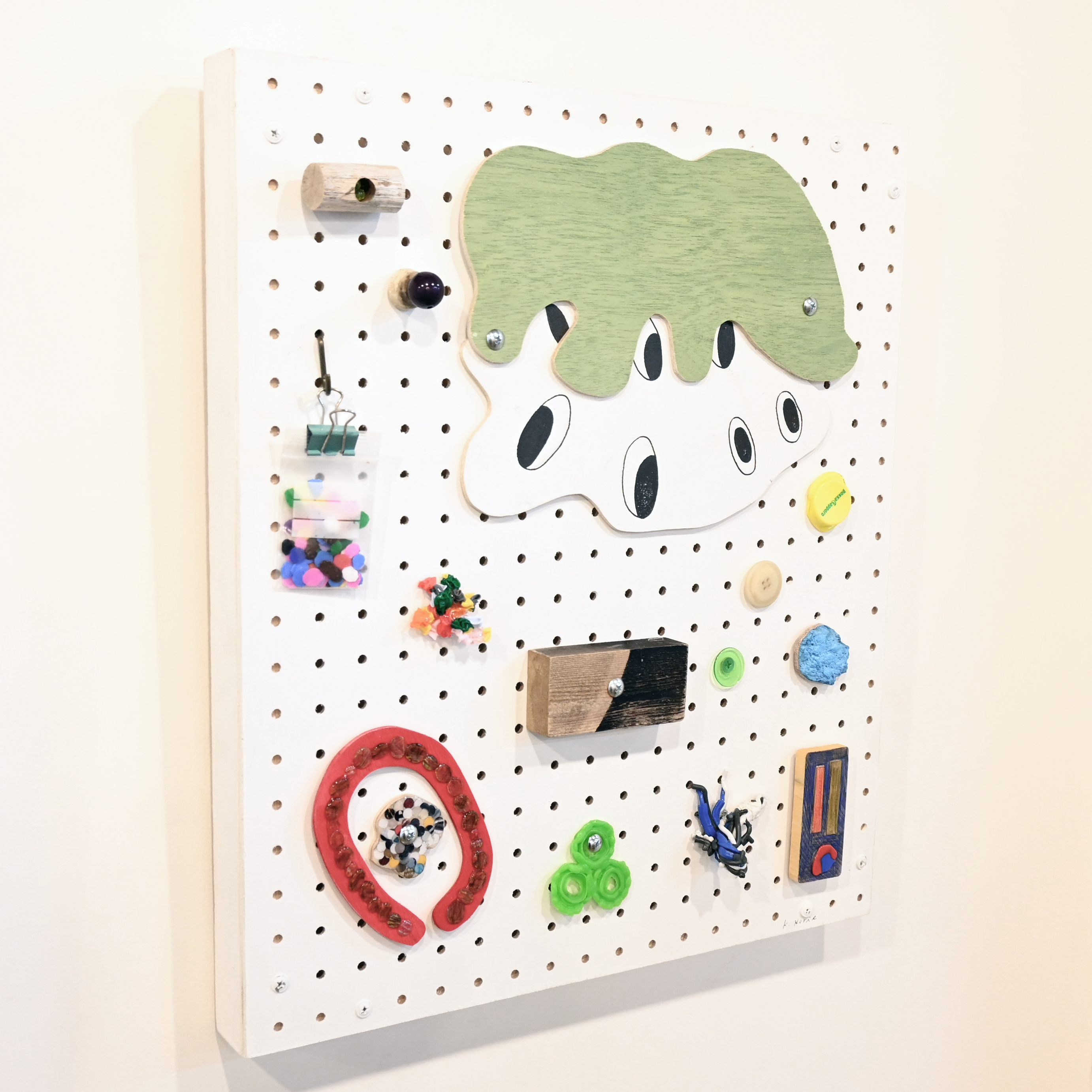 堀江は、日々の暮らしの中で偶然見つけてしまう些細な事柄や、取るに足らないと思い込んでいるような日用品、また不用なモノとして処理してしまいかねない端材やパーツ類、ともすると気付くことなくスルーしてしまいそうな物質や事象を積極的に見出し、掬い上げ、加工し、配置し、描き、作品として構成します。また大胆にカリカチュアライズされキャラクター化された人型の立体作品は、表層と本質及び描くことと作ることについて考察せざるを得ない構造を有しています。