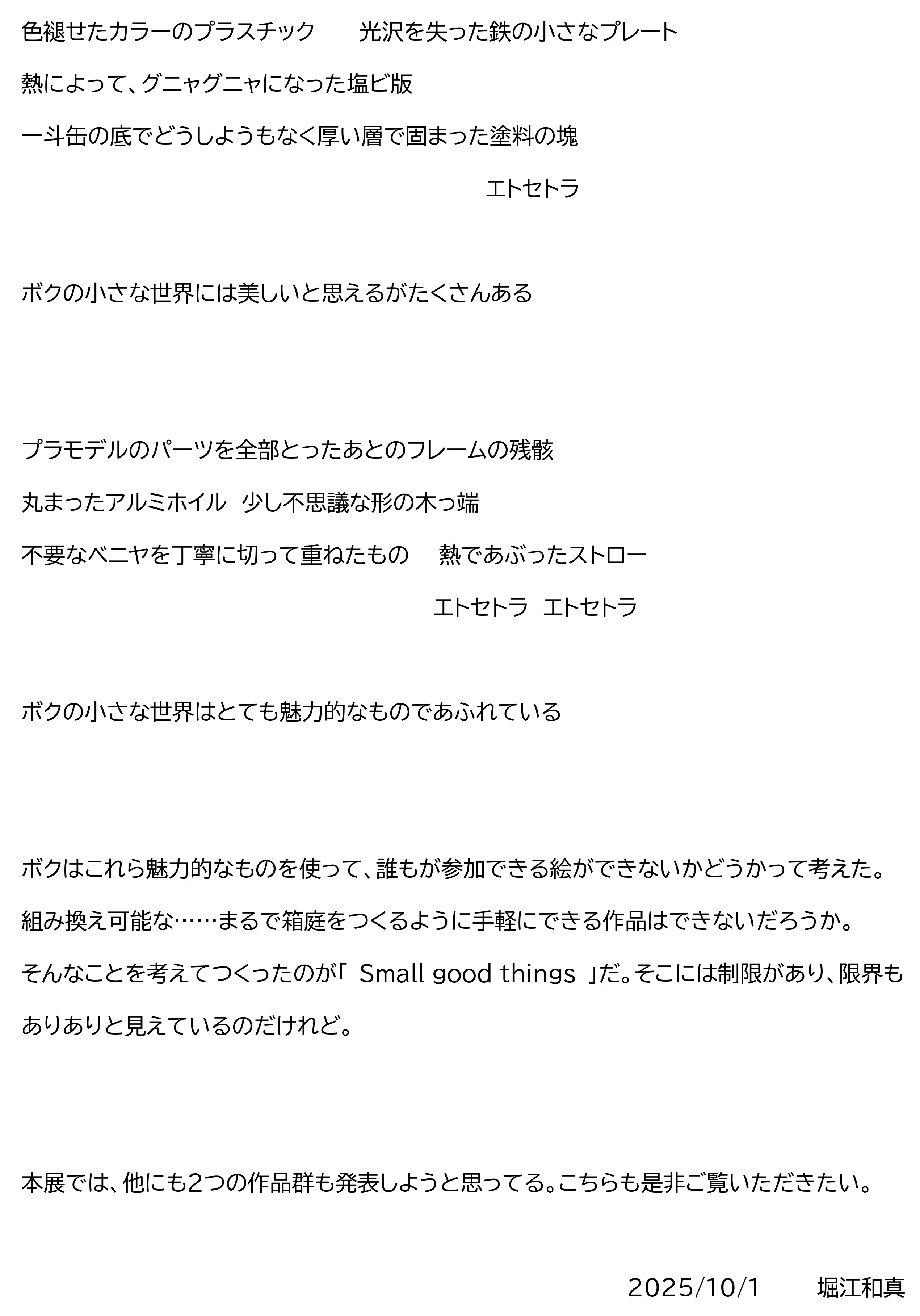 この度、フラットリバーギャラリーにて堀江和真「Small good things」展を開催いたします。