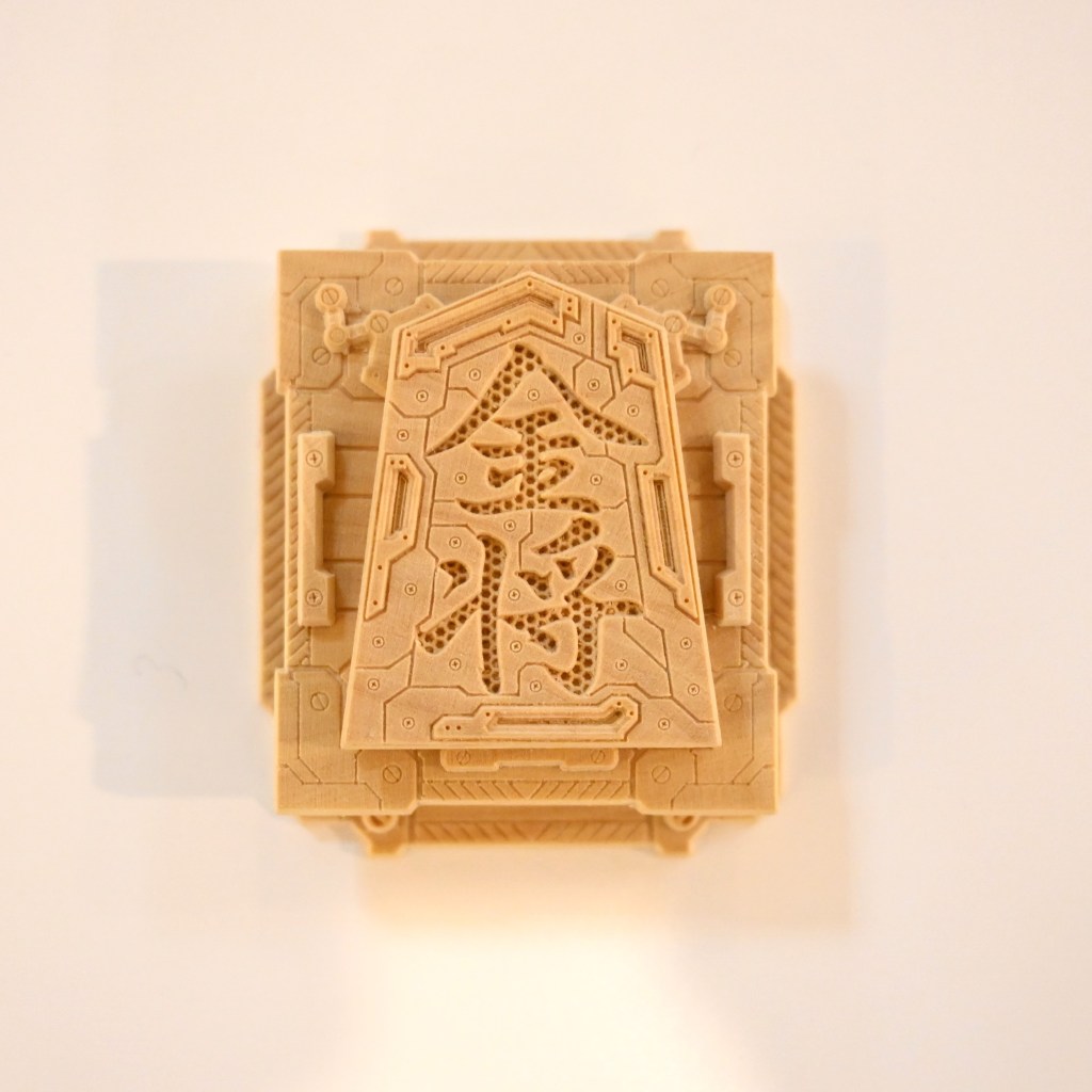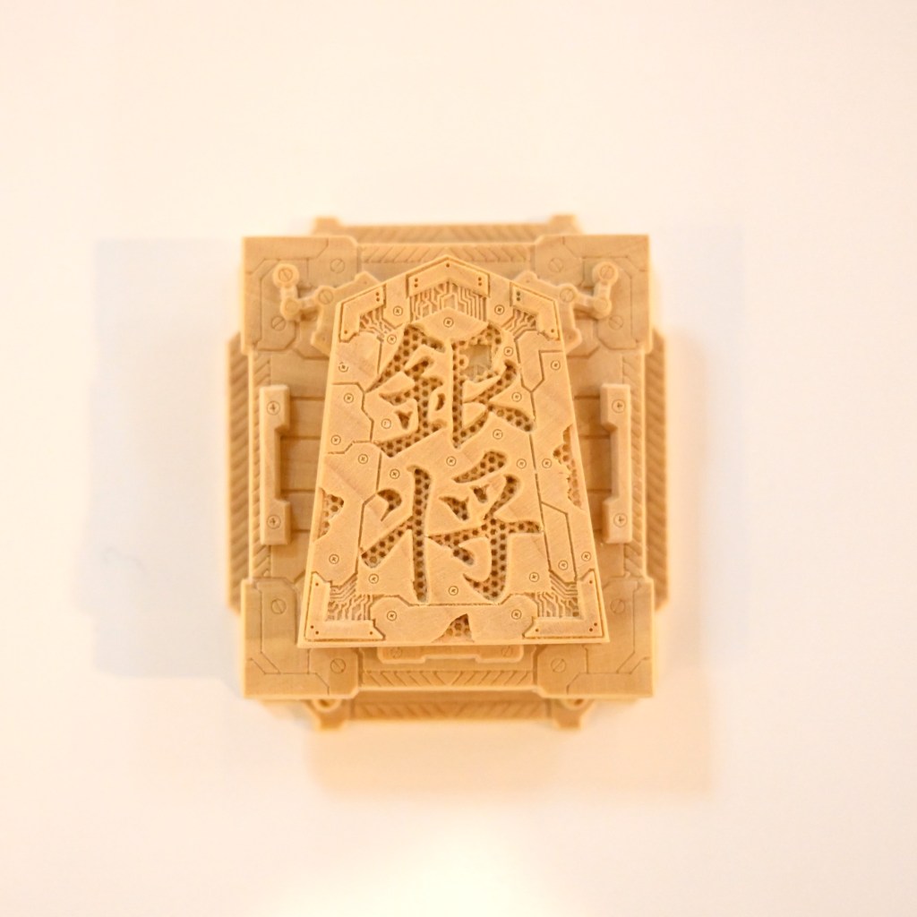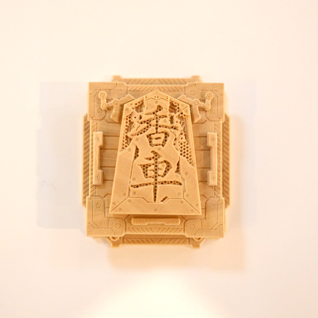 ナカダマコトは所謂木彫の通念とは異なる独特なアプローチで木を彫刻します。まず鋸や鑿有りきで進む制作プロセスとは異なり、作家固有の方法論にてアナログな手技とデジタル技術を用いながら制作されます。ナカダの創り出す繊細な作品は、折り紙や将棋、刀といった日本人にとって馴染みのある形状を主軸としながら、電子基板や緻密なメカのような表層を纏わせることにより、近未来都市やスペースシップのようなSF的世界観を連想させます。またルーペを使用しないと確認することが困難なほど細かいディテールは、よく観察すると配管や空調の室外機、換気扇といった身近なものの形が散見され、それらは木材の持つ表情と相まって、程よい親近感とある種ノスタルジックな趣を醸し出します。