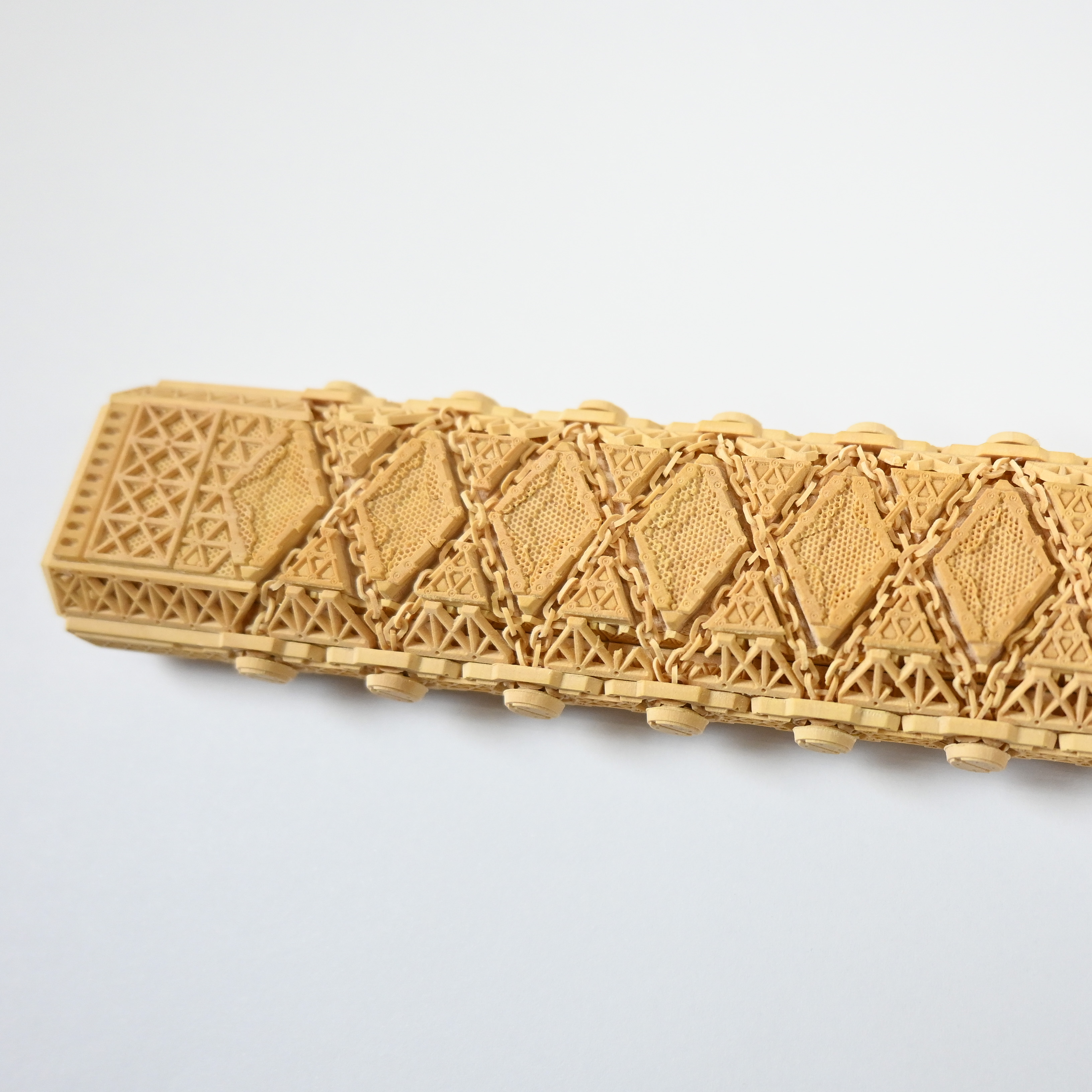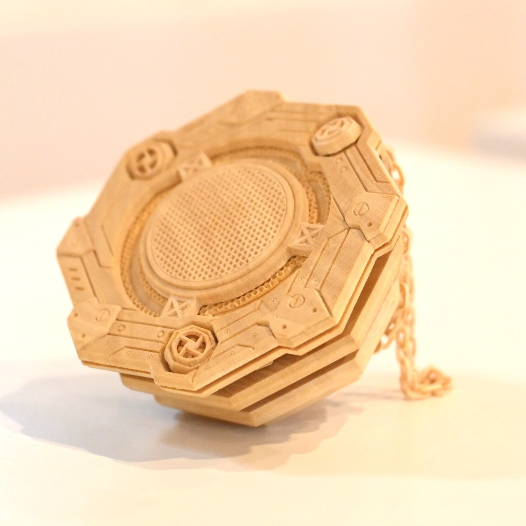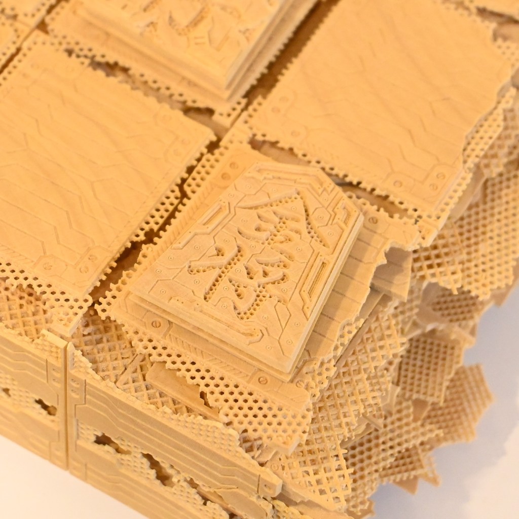 ナカダマコトは所謂木彫の通念とは異なる独特なアプローチで木を彫刻します。まず鋸や鑿有りきで進む制作プロセスとは異なり、作家固有の方法論にてアナログな手技とデジタル技術を用いながら制作されます。ナカダの創り出す繊細な作品は、折り紙や将棋、刀といった日本人にとって馴染みのある形状を主軸としながら、電子基板や緻密なメカのような表層を纏わせることにより、近未来都市やスペースシップのようなSF的世界観を連想させます。またルーペを使用しないと確認することが困難なほど細かいディテールは、よく観察すると配管や空調の室外機、換気扇といった身近なものの形が散見され、それらは木材の持つ表情と相まって、程よい親近感とある種ノスタルジックな趣を醸し出します。